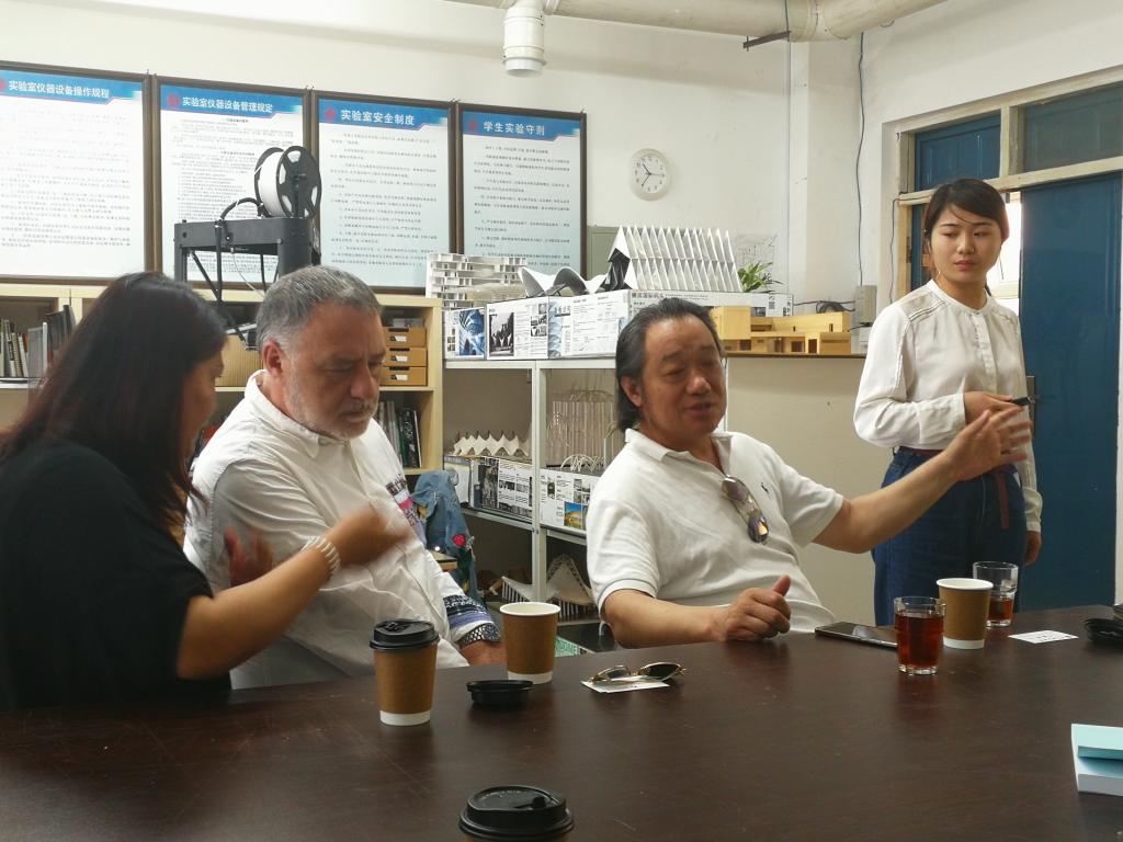于德湖副校长将会见地点精心安排在建筑与城乡规划学院的工作室, 艺术与设计学院和建筑与城乡规划学院先后汇报了各自在相关领域的成果。拉贾乔凡尼教授现场感受和参观了师生工作室和部分作品,作为走遍中国的艺术大师,拉贾乔凡尼教授对我校如此安排给与了高度评价,一再强调这是他最为成功的一次访问,一进入学院大楼即感受到强烈的学术气氛和艺术气息,比起所谓正式接待、官方陪同、概念介绍收获大得多,充分感受到我校专业、务实的态度和开放交流的自信。双方以现场部分作品为例就艺术教育传统、优秀中国建筑保护和影视舞台艺术等交换了意见,探讨了今后校际交流与合作的方式和领域。