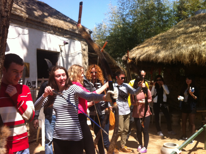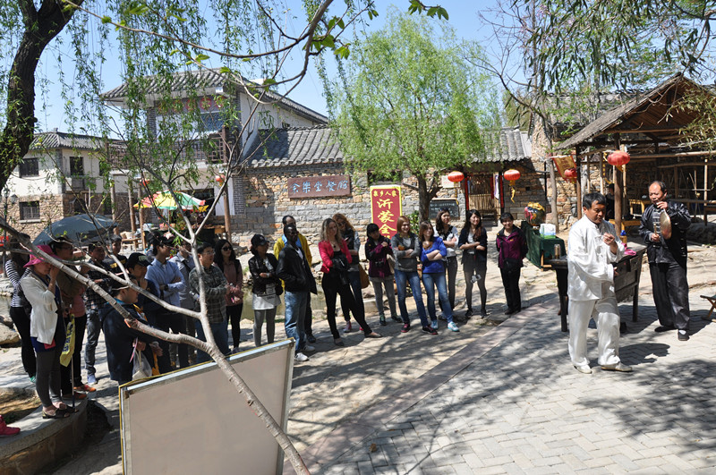 下午,大家游览了沂南传统民居村落竹泉村,看到中国古代的弓箭,同学们表现出浓厚的兴趣,纷纷一展身手。大家参观学习了传统纺线,传统竹编,品尝了富有地区特色的美食—煎饼,了解了中国传统酿酒工艺,并且观看了景区的气功相声表演。