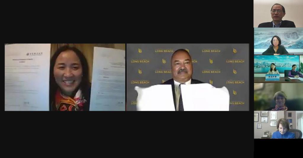 10月22日,我校参加了青岛市与美国长滩市举办的友城视频连线交流活动并与加州州立大学长滩分校签署合作意向书。驻洛杉矶总领馆副总领事施远强,省委外办副主任、省对外友协常务副会长李荣,市外办副主任真珠、长滩—青岛友城委员会代表、加州州立大学长滩分校助理副校长Dr. Jeet Joshee、我校yl34511线路中心处长周红燕等近50人在线出席活动,长滩市市长罗伯特·加西亚录制视频出席。