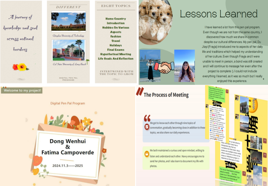 2024年11月,项目面向青岛理工大学和加州州立大学长滩分校的学生公开选拔,我校来自5个学院共51名学生最终与加州州立大学长滩分校学生成功结对笔友。在为期四个月的时间里,两校102名学生在美食、节日、摄影、美妆、时尚、旅行、影视制作等多领域开展了线上跨文化主题交流。