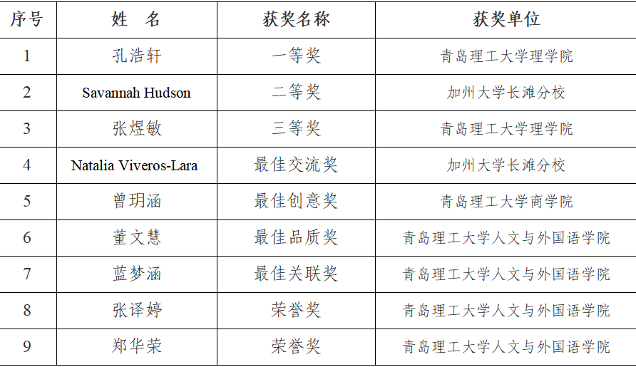 在本次活动中,组委会共设置一、二、三等奖及最佳交流奖、最佳创意奖、最佳品质奖、最佳关联奖7个奖项。经评审委员会评审,我校学子凭借扎实的专业素养和跨文化沟通能力,在中外结对队伍中脱颖而出,成功斩获其中6项大奖,获奖数量和质量均创历史新高。中华人民共和国驻洛杉矶总领事馆、长滩-青岛友城委员会、中美两校等均对此次比赛给予了高度评价。(撰稿:李爱晶、冯志国;摄影:王云霞;审核:张鹏、郭印)