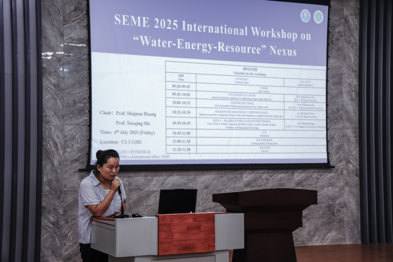 接下来的报告环节,来自国内外的专家学者围绕各自研究方向作学术报告。韩国工程院青年院士、延世大学Sang-Hyoun Kim教授的报告聚焦于“厌氧动态膜强化污水污泥消化”,群山国立大学Ju-Hyeong Jung教授介绍了“有机废物暗发酵生物制氢”,仁荷大学Ali Ashraf Joolaei博士则探讨了“通过施加电压输入增强食物垃圾与生物塑料的厌氧共消化”技术,学院黄书娟教授报告题目为“探索pH对好氧颗粒污泥与生物聚合物回收的影响”,展示了学院在资源化方向的研究成果与实践探索。