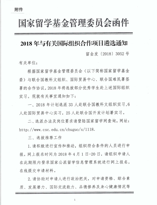 根据国家留学基金委 《2018年与有关国际组织合作项目遴选通知》(留金发〔2018〕3052号)要求,现将2018 年与有关国际组织合作项目申报工作有关事项通知如下: